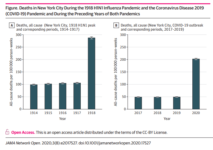 Comunque, vale la pena di rifare il punto, per completezza di ragionamento, su quanto sia effettivamente grave l’epidemia di SARS-CoV-2. Le misure di contenimento dell’infezione adottate nella maggior parte dei paesi (lockdown nazionale, distanziamento sociale, mascherine) hanno frenato la diffusione del virus allungando i tempi dell’epidemia e riducendo la mortalità (almeno nel medio-breve periodo). Tuttavia alcune regioni sono state colpite estesamente prima che le misure di contenimento diventassero operative. Ad esempio, New York è stata duramente colpita e attualmente si registrano siero-prevalenze nella popolazione attorno al 30-40%. Come possiamo osservare, l’entità dei decessi causati dalla famosa Spagnola e dal COVID è stata simile (3 volte e 4 volte vs baseline, rispettivamente), al netto di una mortalità di base per tutte le cause ovviamente diversa visto il secolo di distanza e i progressi della medicina (circa dimezzata; Faust et al., JAMA Netw Open, 2020 Aug 3).