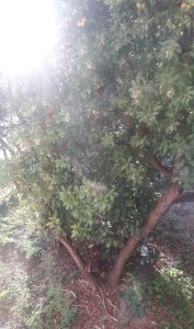 Alcune sono cadute, altre come palline incoronano di preziosità la vista. Talmente meraviglioso da raccontarlo a mia sorella un giorno che neppure ricordo ma con certo un’enfasi di descriverlo che è sopraggiunta come fuoco acceso. E da lì, camminando una domenica mattina, lei lo nota senza averlo mai avuto dinanzi gli occhi solo ad avermi ascoltata. La pianta è dentro un cortiletto che si affaccia poc’anzi sul marciapiede in cui siamo e spende i suoi frutti. Raccogliamo una bacca, la mordiamo, la gustiamo, sorridiamo e sventoliamo che è buona e che ne vorremmo altre e ancora da mangiare. Poi proseguiamo verso il litorale e verso i giardinetti.