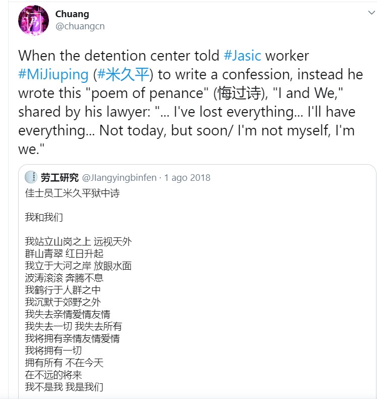 Nel maggio del 2018 gli operai firmano una petizione per costituire un sindacato, viste le pessime condizioni di lavoro e le azioni illegali del management, che arrivano alla violenza fisica. La All-China Federation of Trade Unions (中华全国总工会), che è l’unione dei sindacati cinesi rifiuta la petizione. Gli operai cercano comunque di costituire una società di mutuo soccorso, ma nel luglio 2018 quattordici di loro vengono arrestati, tra loro Mi Jiuping 米久平, uno dei principali attivisti ed anche l’autore della prima poesia che riporto.