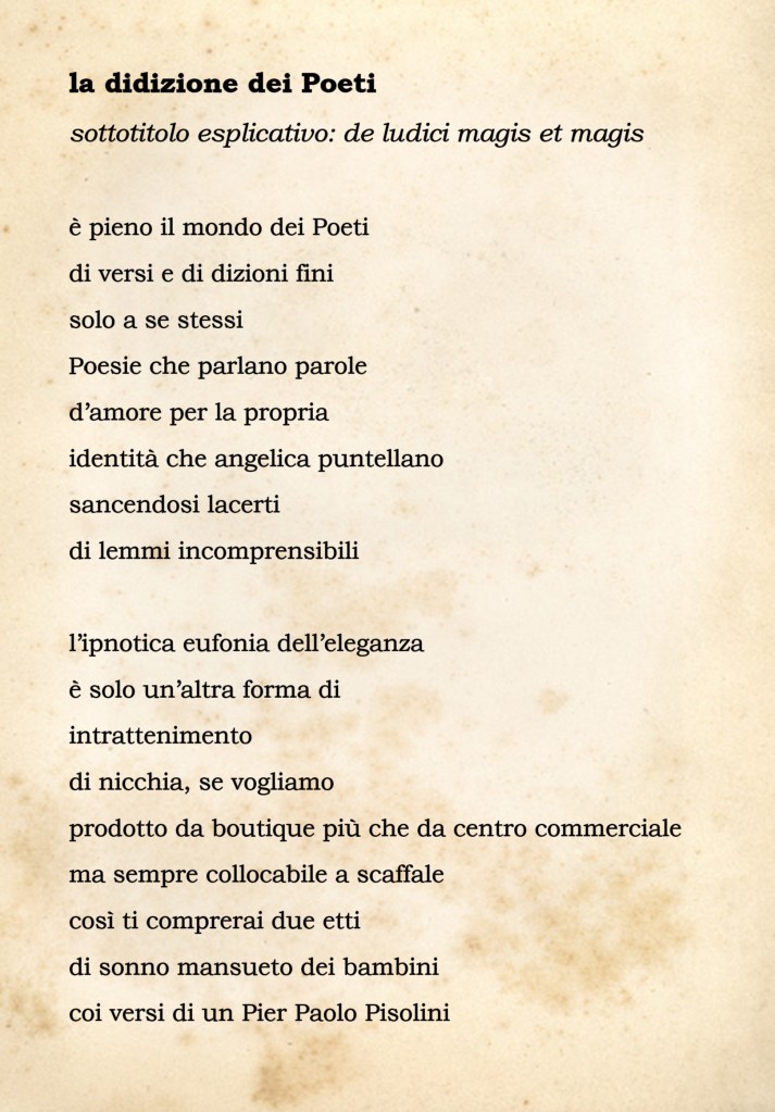 1. Carissimo, che bella questa tua scorribanda. Ti trovo in gran forma. Che pasolini/malos si spari ai versi neobariani et alia non sorprende.Eppure in questa boutique, o più modestamente bouquet, abbiamo ospitato versi, a mio parere, notevoli ultimamente (non ti dirò naturalmente quali e chissà se magari con il tuo fiuto non riuscirai a scovarli :-). Un abbraccio