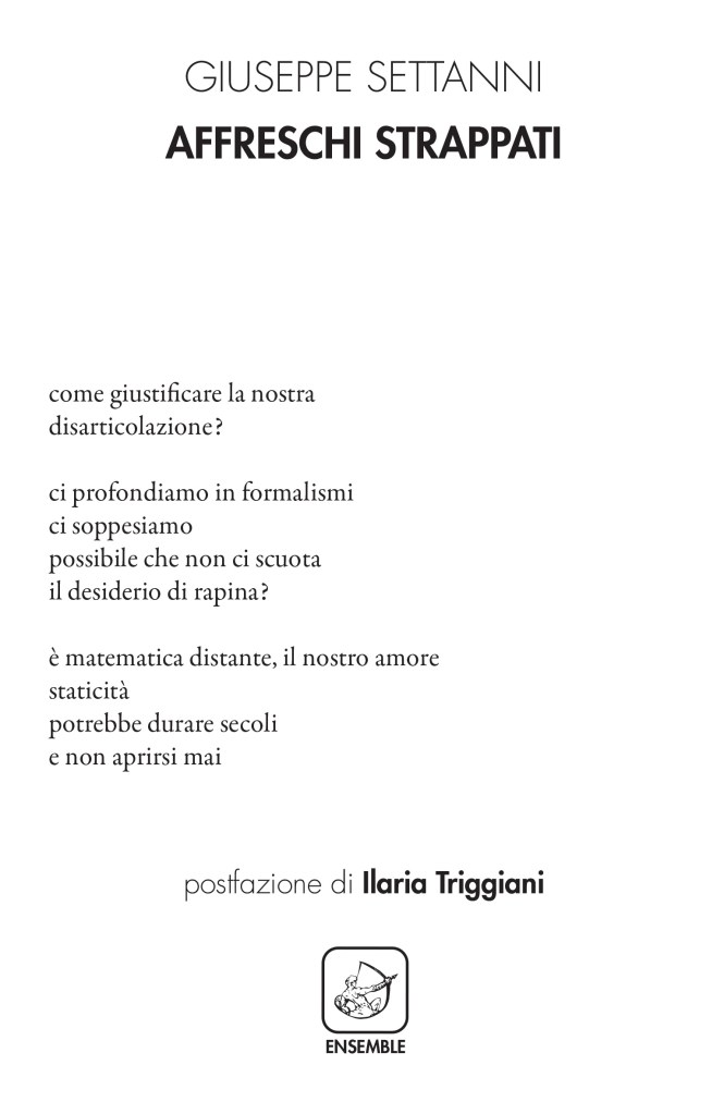 Cosa fa di un verso, una poesia? Cosa rende un uomo, anche un poeta? Sono queste le domande da porsi al termine di Affreschi strappati, terza pubblicazione di Giuseppe Settanni, arrivata un po’ insieme alla stessa maturità anagrafica dell’autore. Forse perché, già dal titolo, si avvertiva un senso di rottura, un piccolo momento – o motivo? – di ribellione, un’inquietudine non ancora risolta, ma finalmente rivelata.