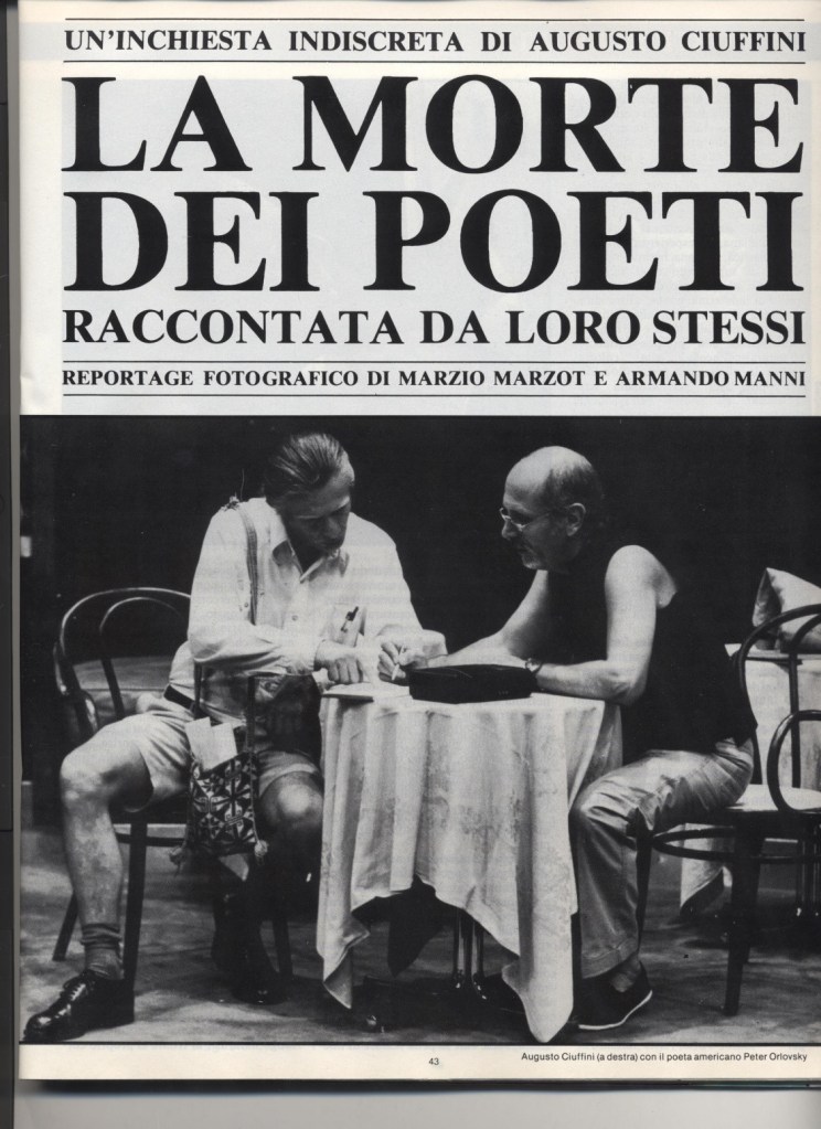 Nel numero del Gennaio \ Febbraio del 1986 è stata pubblicata un’inchiesta di Augusto Ciuffini : “la morte dei poeti” , a undici poeti viene chiesto: ”Come immagini  che sarà la tua morte?”, le risposte  sono orali, viene trascritto il parlato.  Mi è sembrato interessante riproporla.